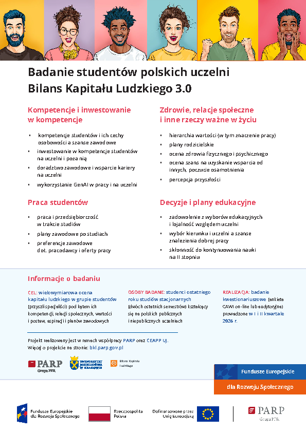 Badanie dotyczy wykształcenia i doświadczeń zawodowych, a jego celem jest wielowymiarowa ocena kapitału ludzkiego w grupie studentów pod kątem kompetencji, relacji społecznych, wartości i postaw, aspiracji oraz planów zawodowych. Wyniki badania będą stanowiły podstawę m.in. do projektowania działań wspierających osoby młode na rynku pracy, a więc także Ciebie.