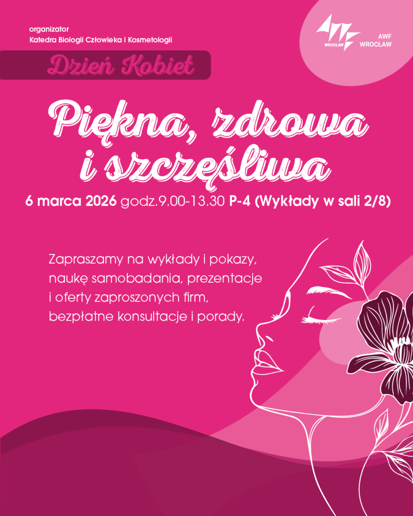 Zapraszamy na wydarzenie Zapraszamy na wykłady i pokazy, naukę samobadania, prezentacje oferty zaproszonych firm, bezpłatne konsultacje i porady. Data: 6.03.2026 r.Godzina: 9.00-13.30 Miejsce: sala 2/8 wykłady oraz hol w P-4 przed salą 2/8 – stoiska naszych partnerów Agenda: Wstęp wolny dla wszystkich chętnych